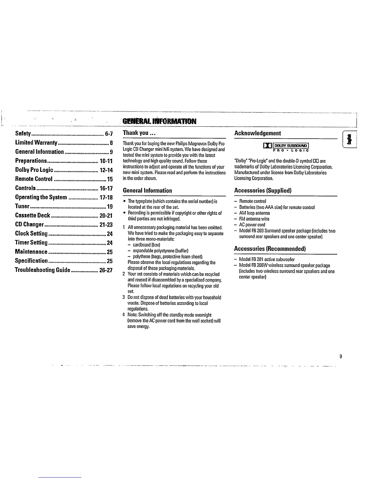 Philips FW 375P - Table of Contents; General Information; Accessories