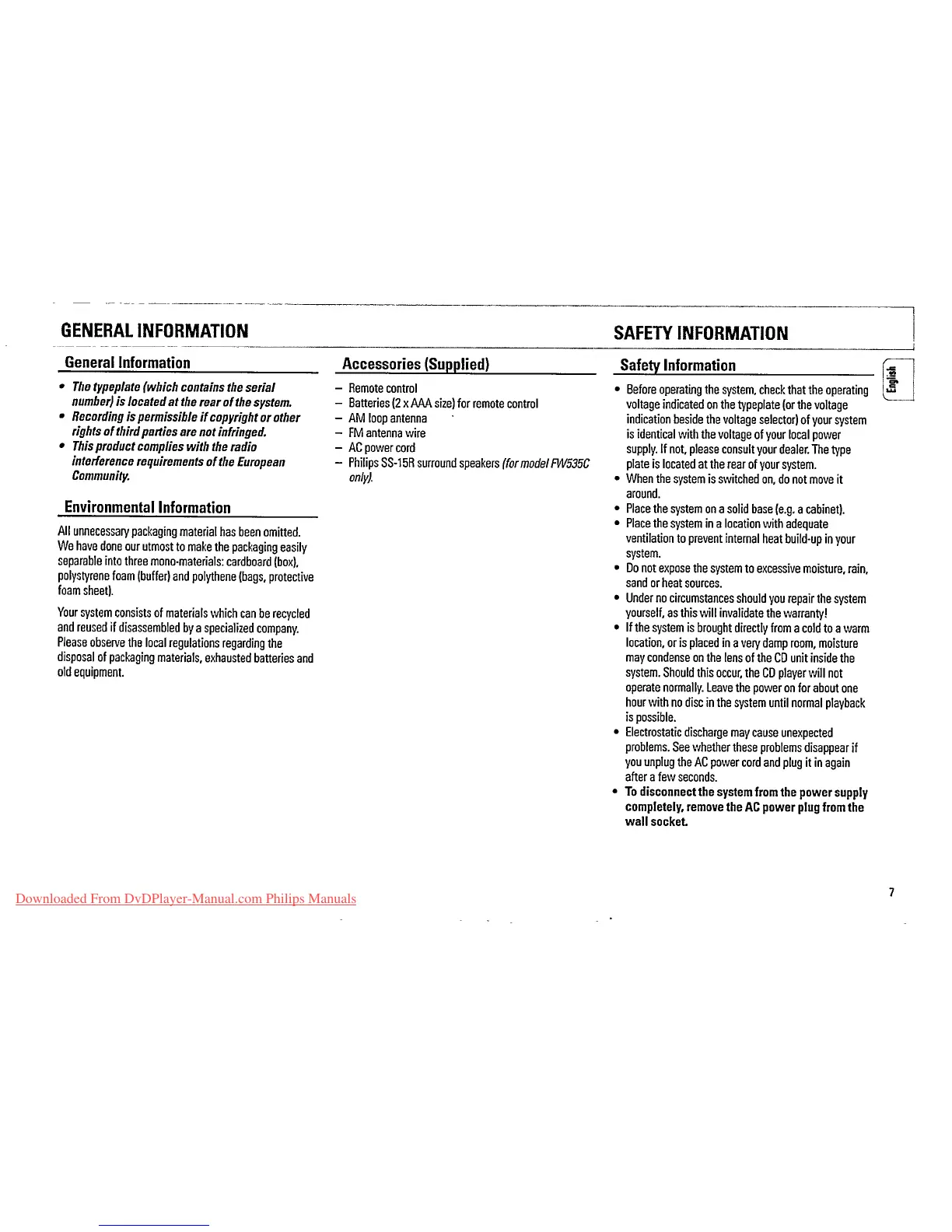 Philips FW 570C - General Information; Environmental Information; Accessories Supplied; Safety Information