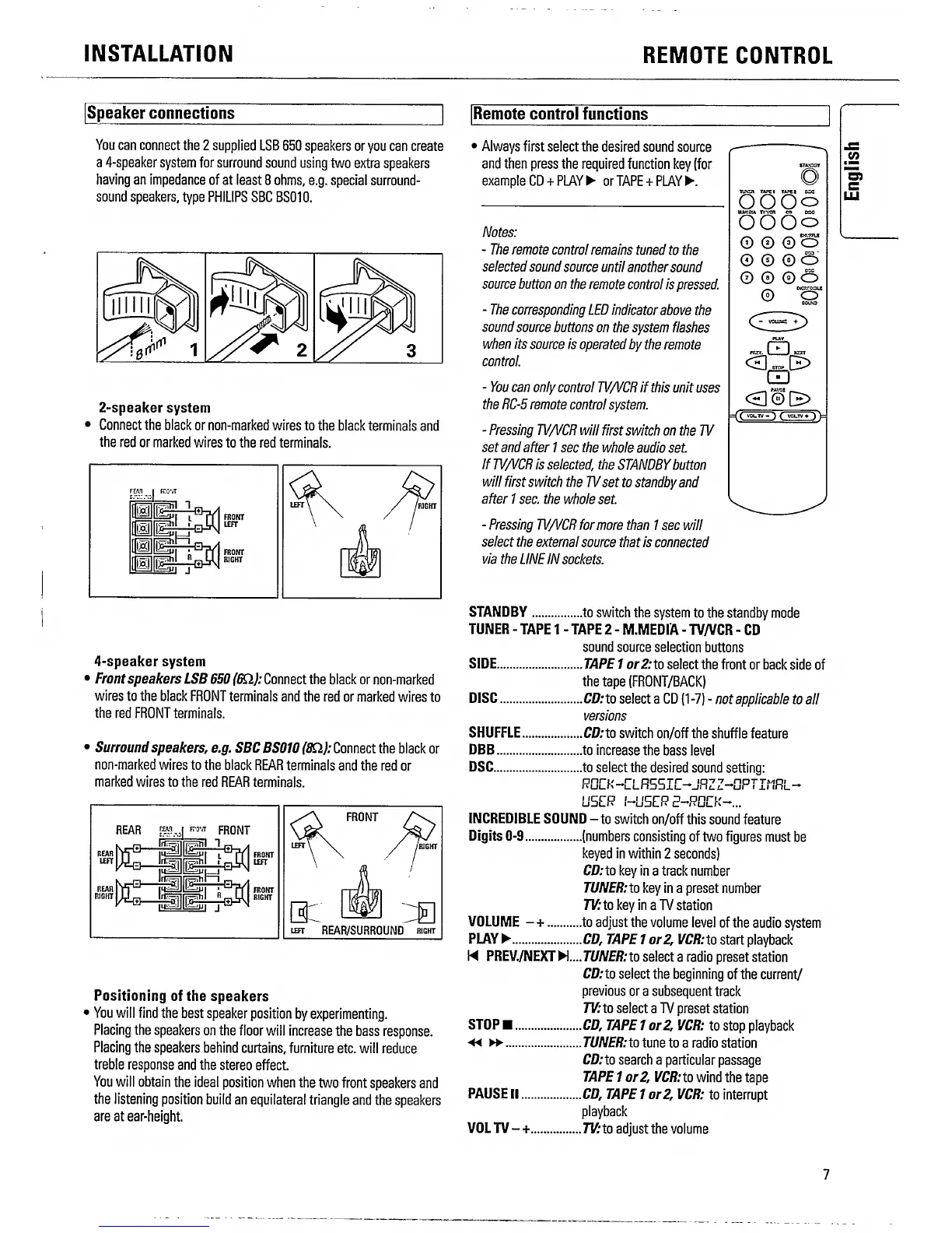 Philips FW 630 - Speaker connections; Positioning of the speakers; REMOTE CONTROL; Remote control functions