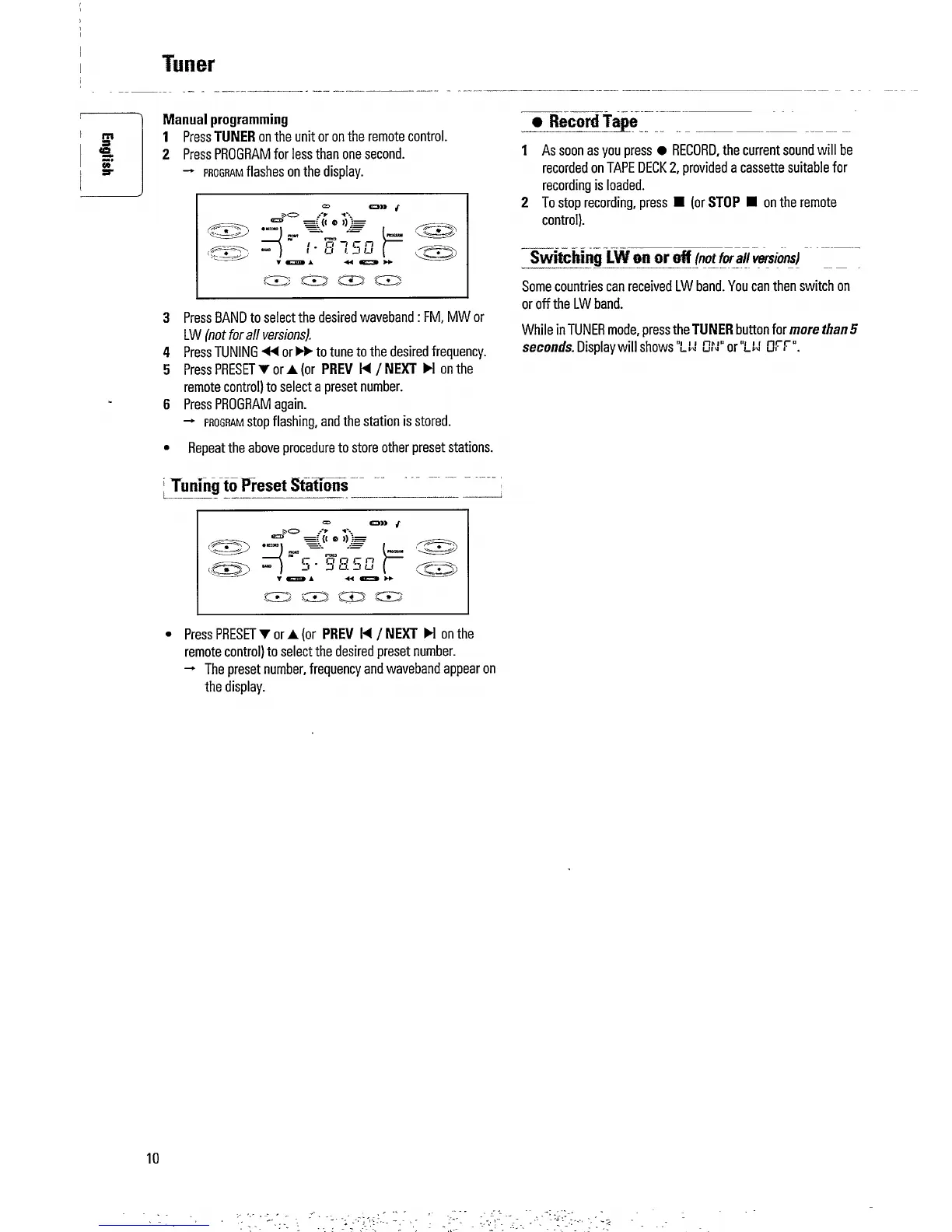Philips FW 730C - Advanced Tuner Functions; Manual Programming and Tape Recording; Preset Station Tuning