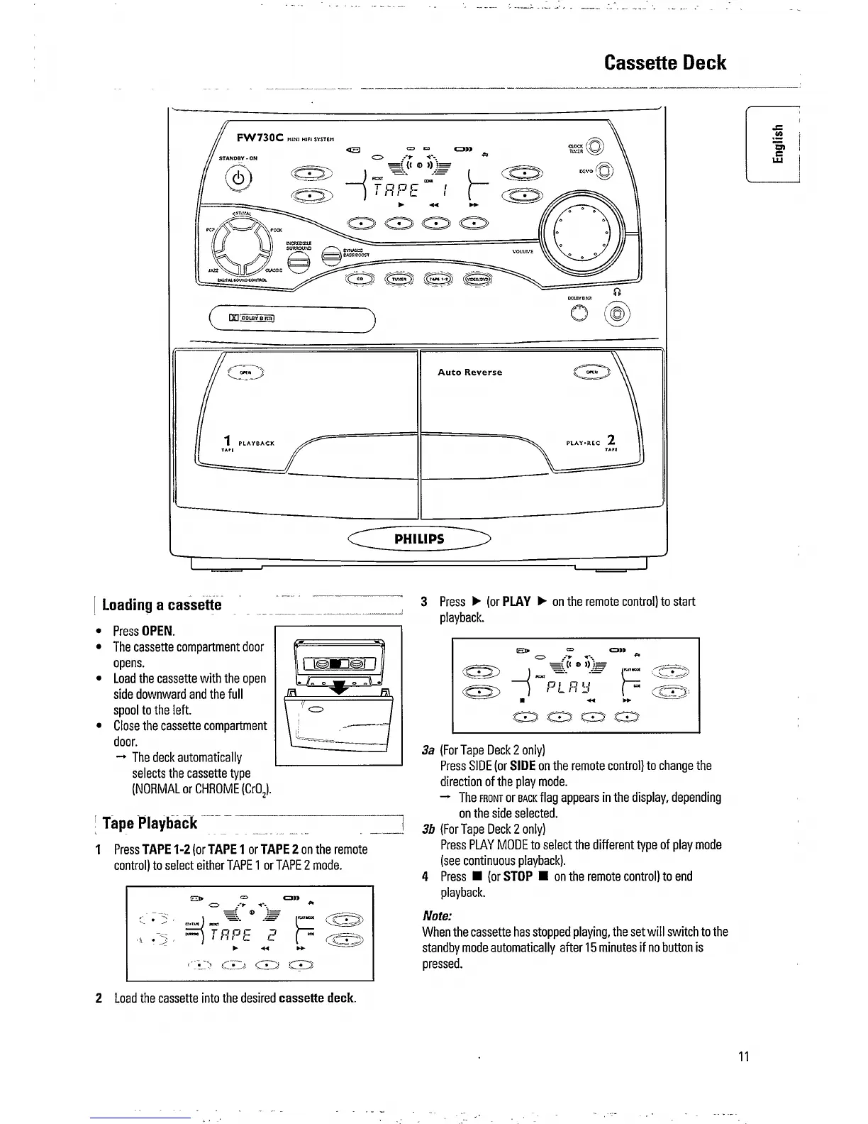 Philips FW 730C - Cassette Deck Operation; Loading and Playing Cassettes