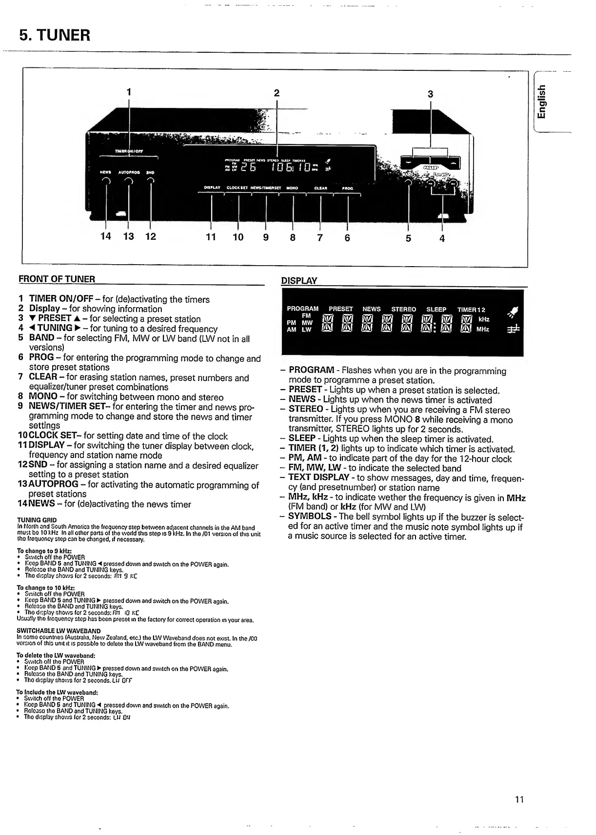 Philips FW 80 - 5. TUNER OPERATION; Tuner Front Panel and Display