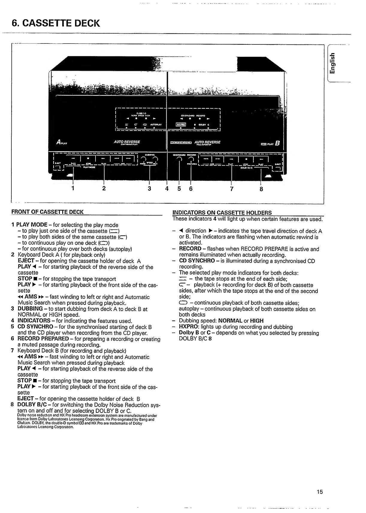 Philips FW 80 - 6. CASSETTE DECK FEATURES; Cassette Deck Controls and Indicators