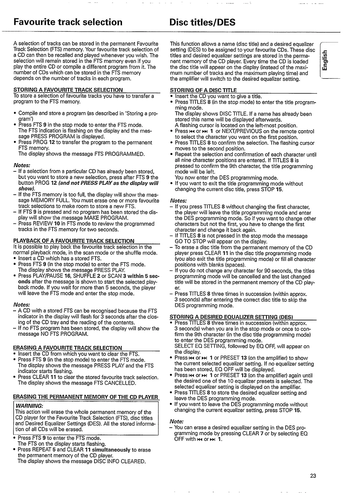 Philips FW 80 - Favourite Track Selection and Disc Titles; Managing Favourite Tracks (FTS); Disc Titles, EQ Settings, and Memory Erasure
