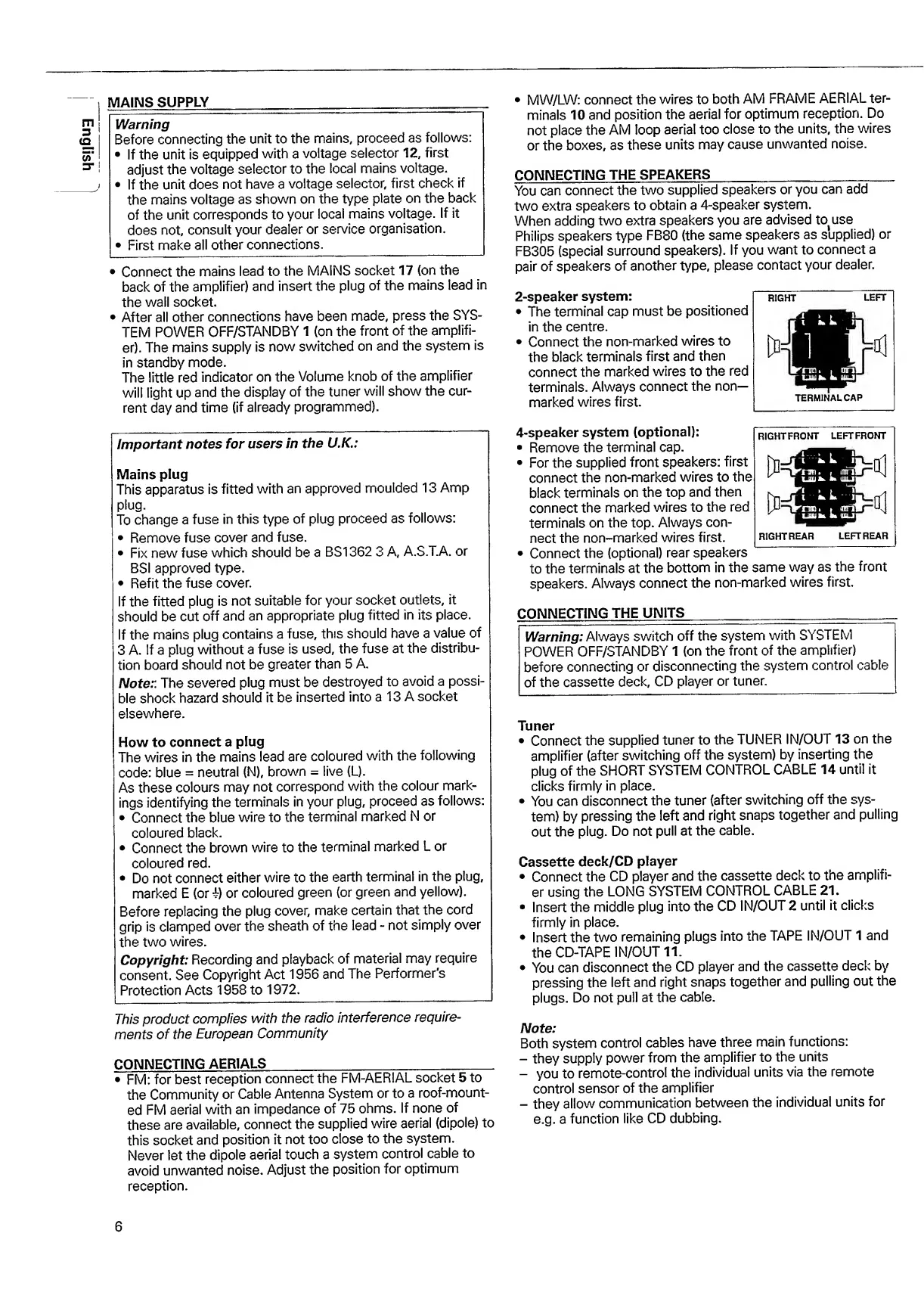 Philips FW 80 - Mains Supply and Aerial Connection; Mains Power and Plug Setup; Connecting Aerials and Speakers