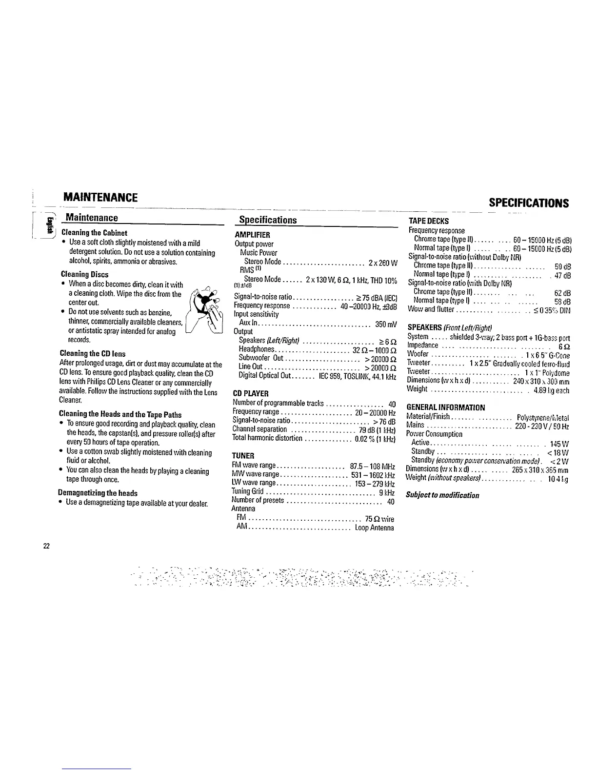 Philips FW 850C - System Maintenance and Specifications; Cleaning Procedures for System Components; Detailed Technical System Specifications