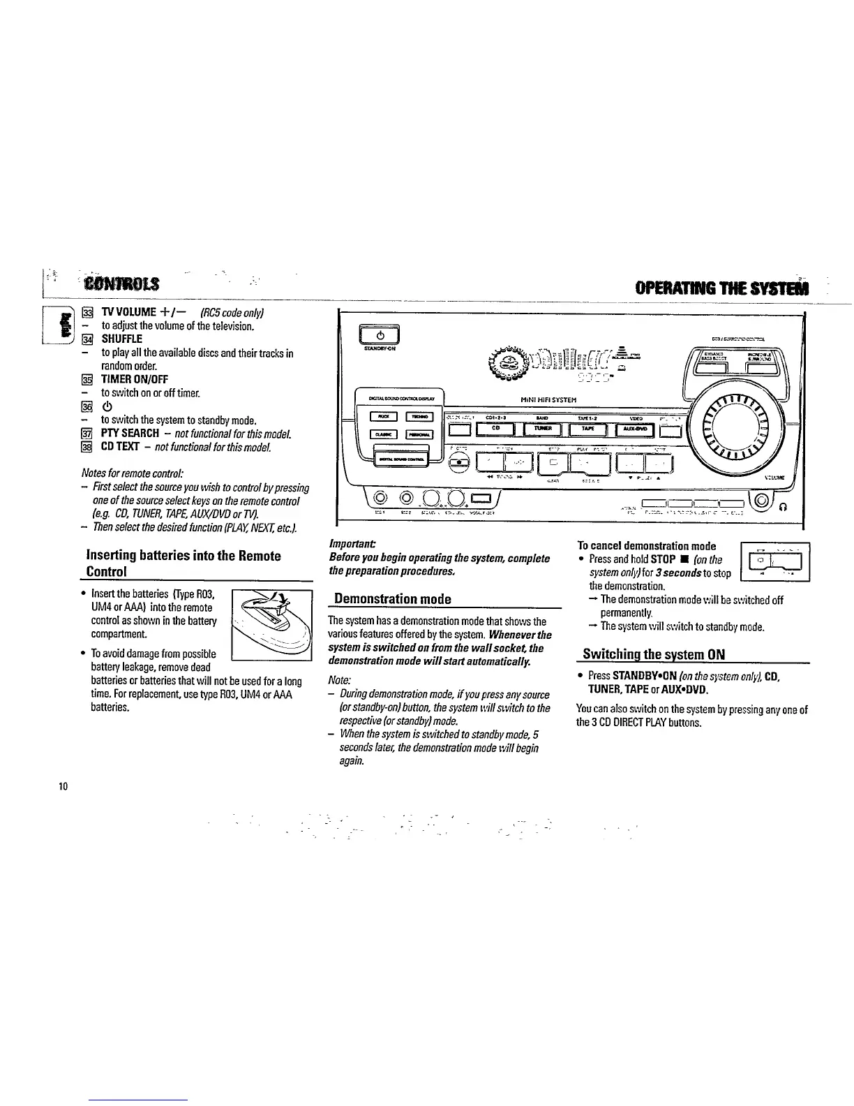 Philips FW 855C - Operating The System; Remote Control Battery Installation; Demonstration Mode; System Power On