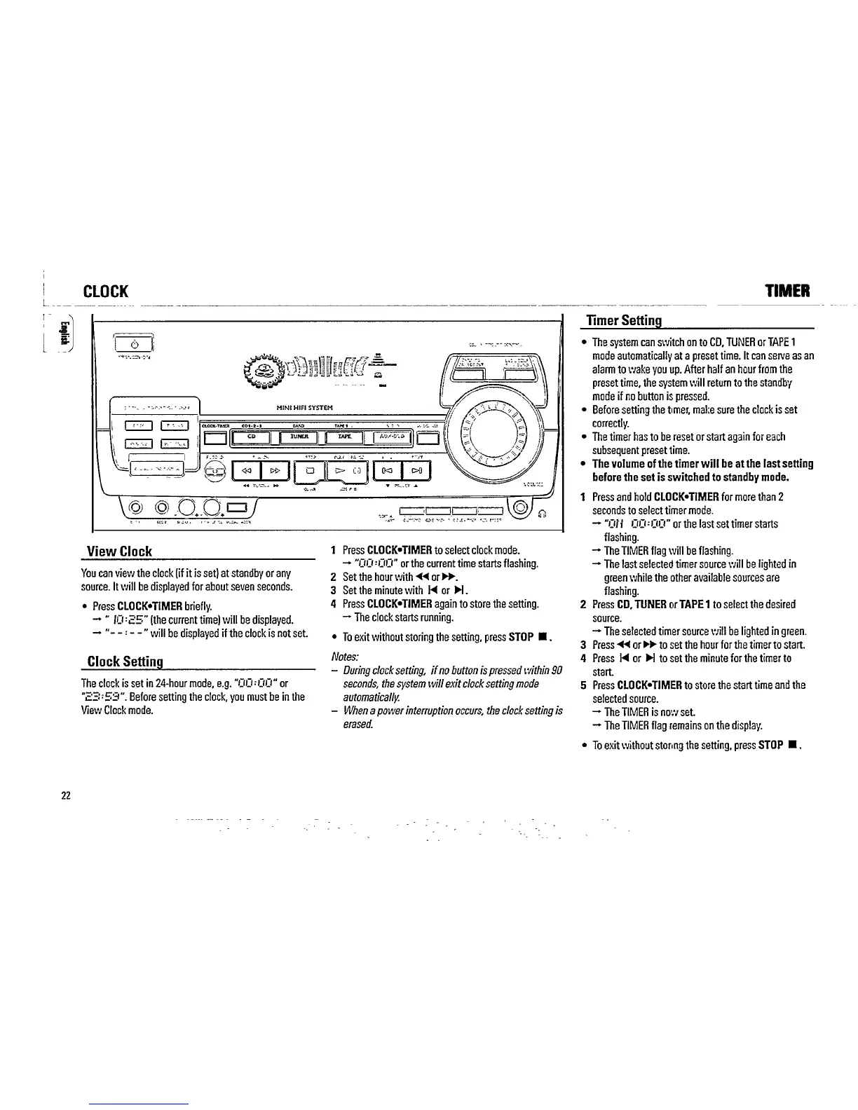 Philips FW 855C - Clock and Timer Functions; Viewing the Clock; Setting the Clock; Setting the Timer