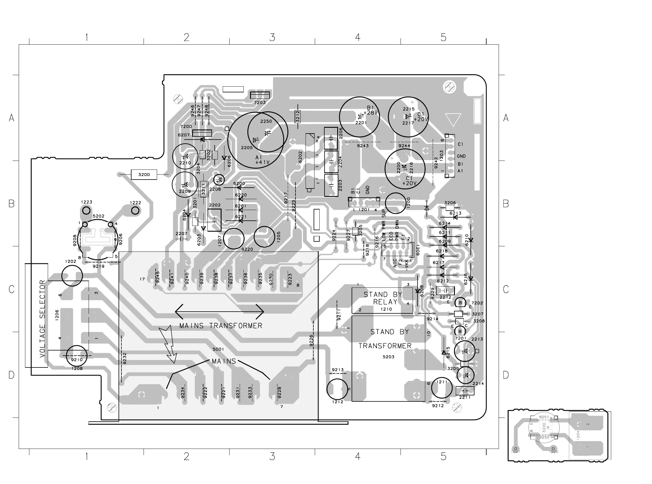 Philips FW-C390 - MAINS BOARD COPPERSIDE VIEW; Voltage Selector and Transformer Area