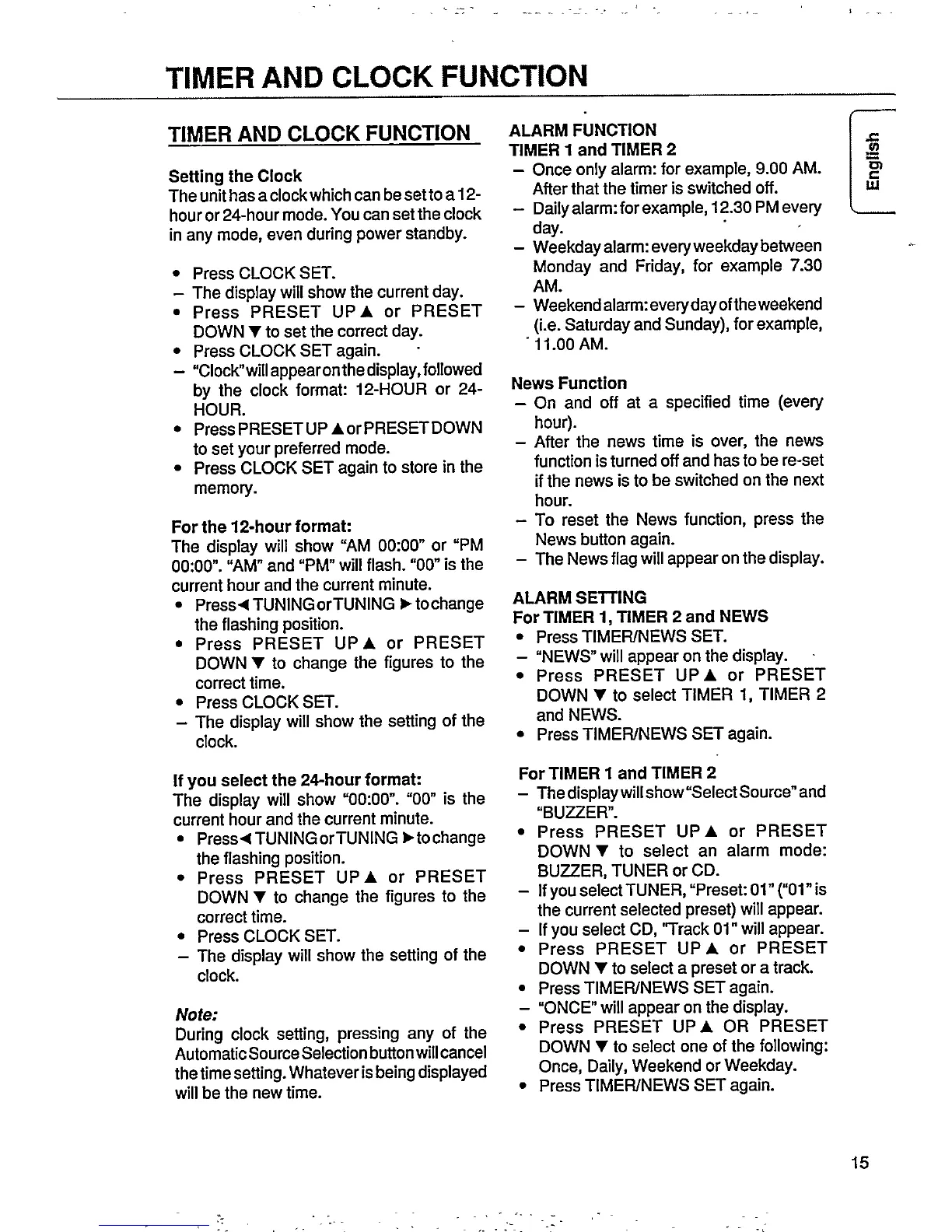 Philips FW20 - TIMER AND CLOCK FUNCTION; ALARM FUNCTION; ALARM SETTING