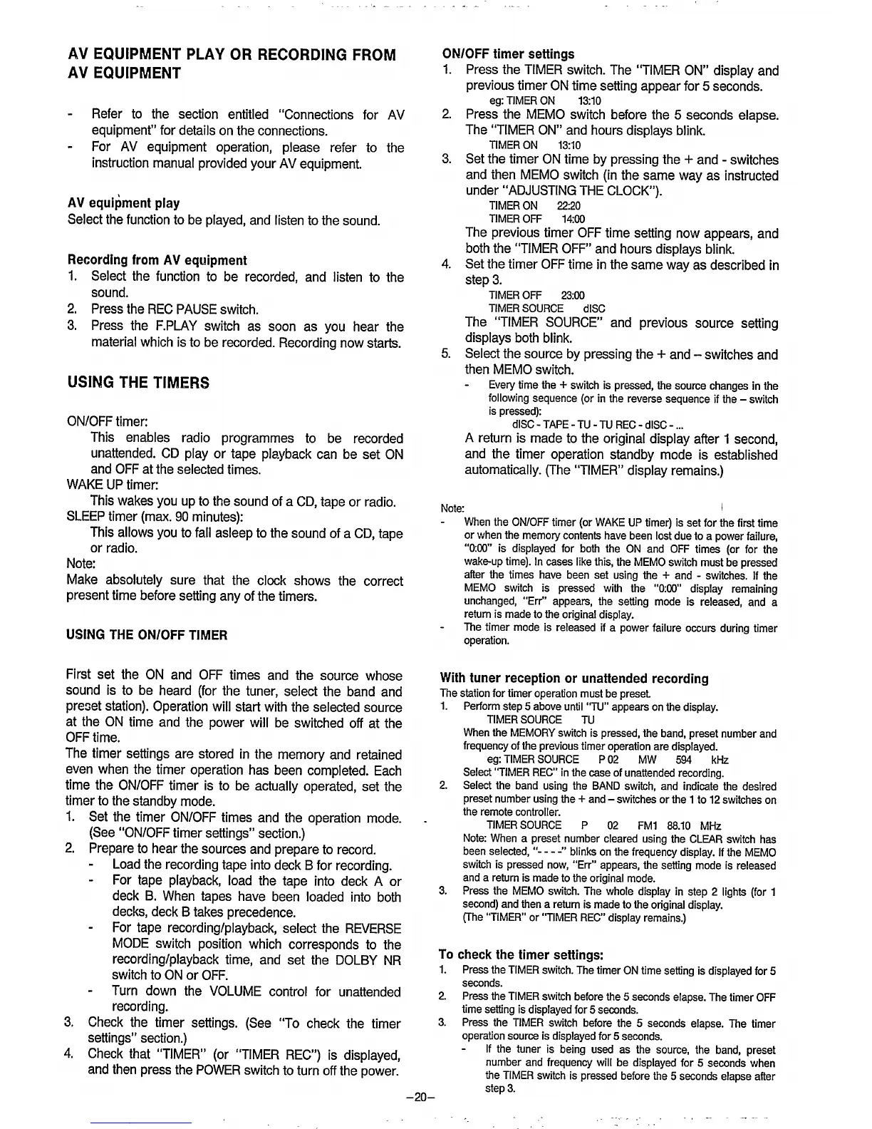 Philips FW2019 - Timer Functions; Setting the ON;OFF Timer; Tuner Presets for Timers; Verifying Timer Settings