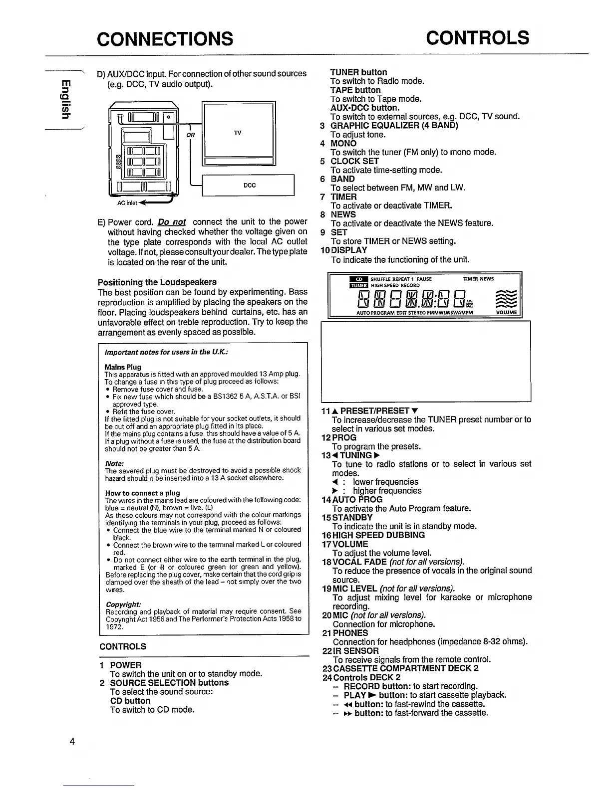 Philips FW26/25 - CONNECTIONS AND CONTROLS; External Connections and Power Safety; Main Unit Control Functions