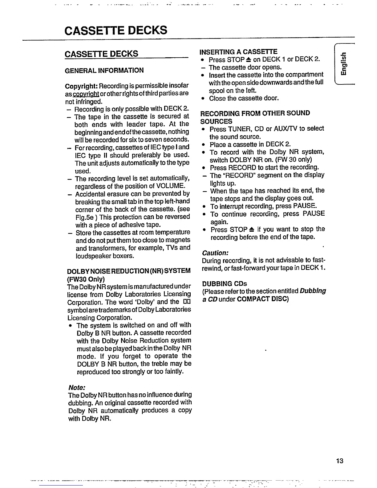 Philips FW30 - CASSETTE DECKS; Inserting a Cassette; Recording from Other Sources