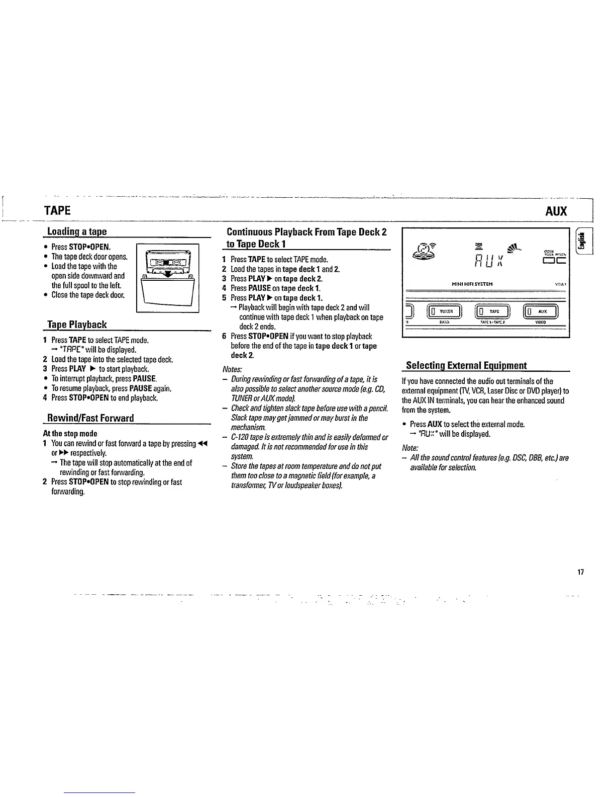 Philips FW339C/22 - Continuous Tape Playback; Auxiliary Input Operation; Connecting and Selecting External Sources