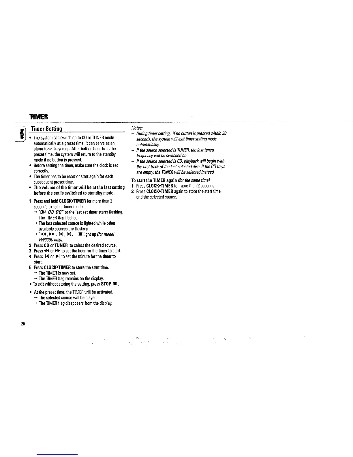 Philips FW339C/22 - Timer Setting; Timer Operation and Setup; Starting the Timer