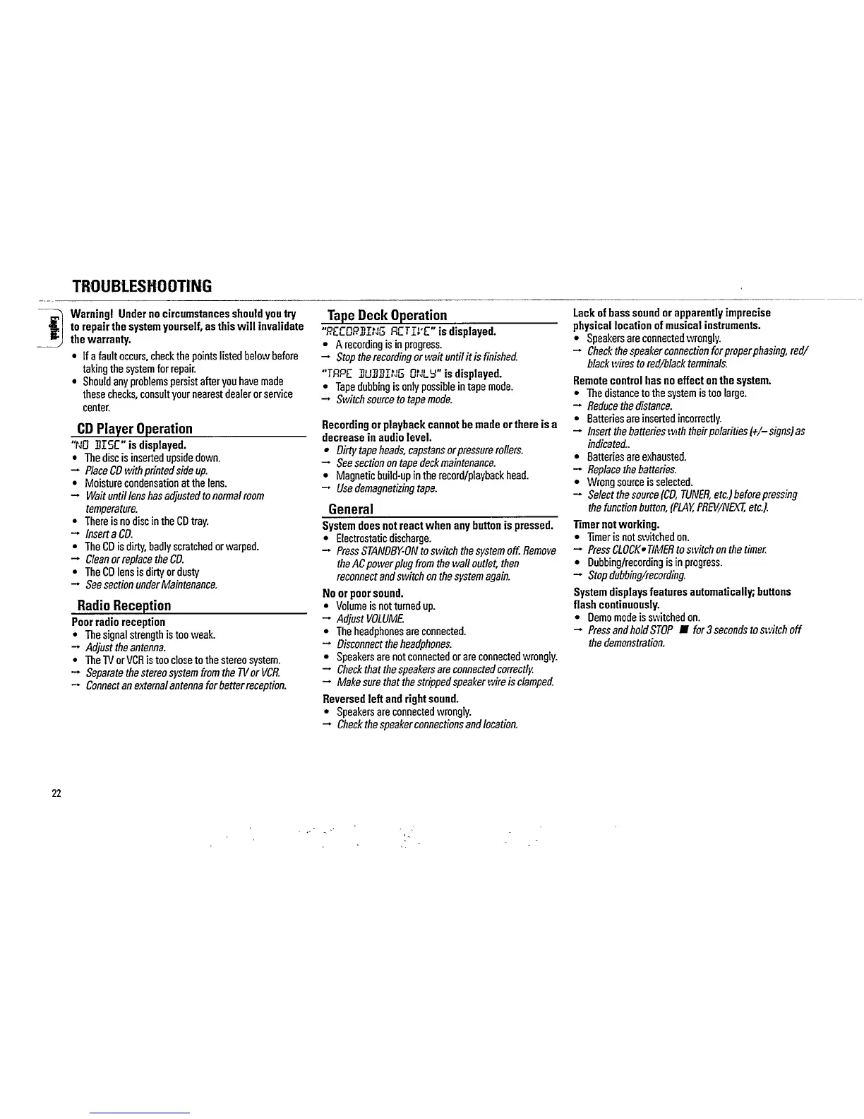 Philips FW339C/22 - Troubleshooting Guide; CD Player and Radio Reception Issues; Tape Deck and Sound Problems; System Responsiveness and Remote Control