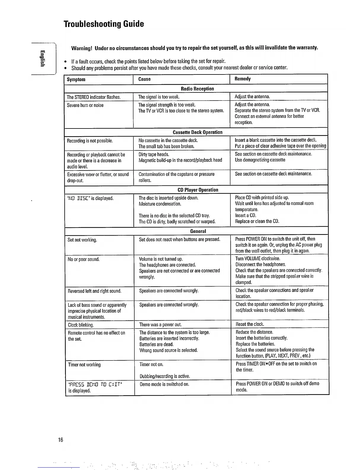 Philips FW352C/25 - Troubleshooting Common Issues; Radio Reception Problems; Cassette Deck Malfunctions; CD Player Errors
