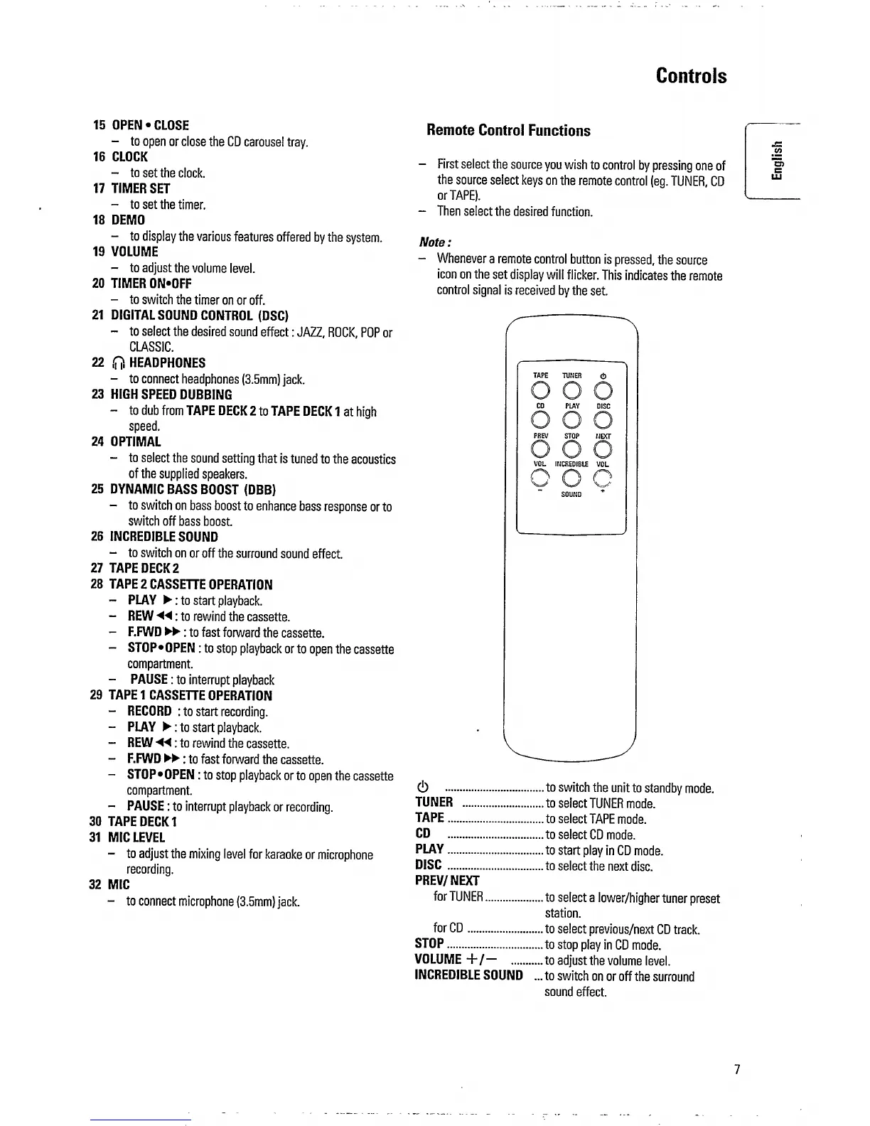 Philips FW352C/25 - Remote Control Functions Guide