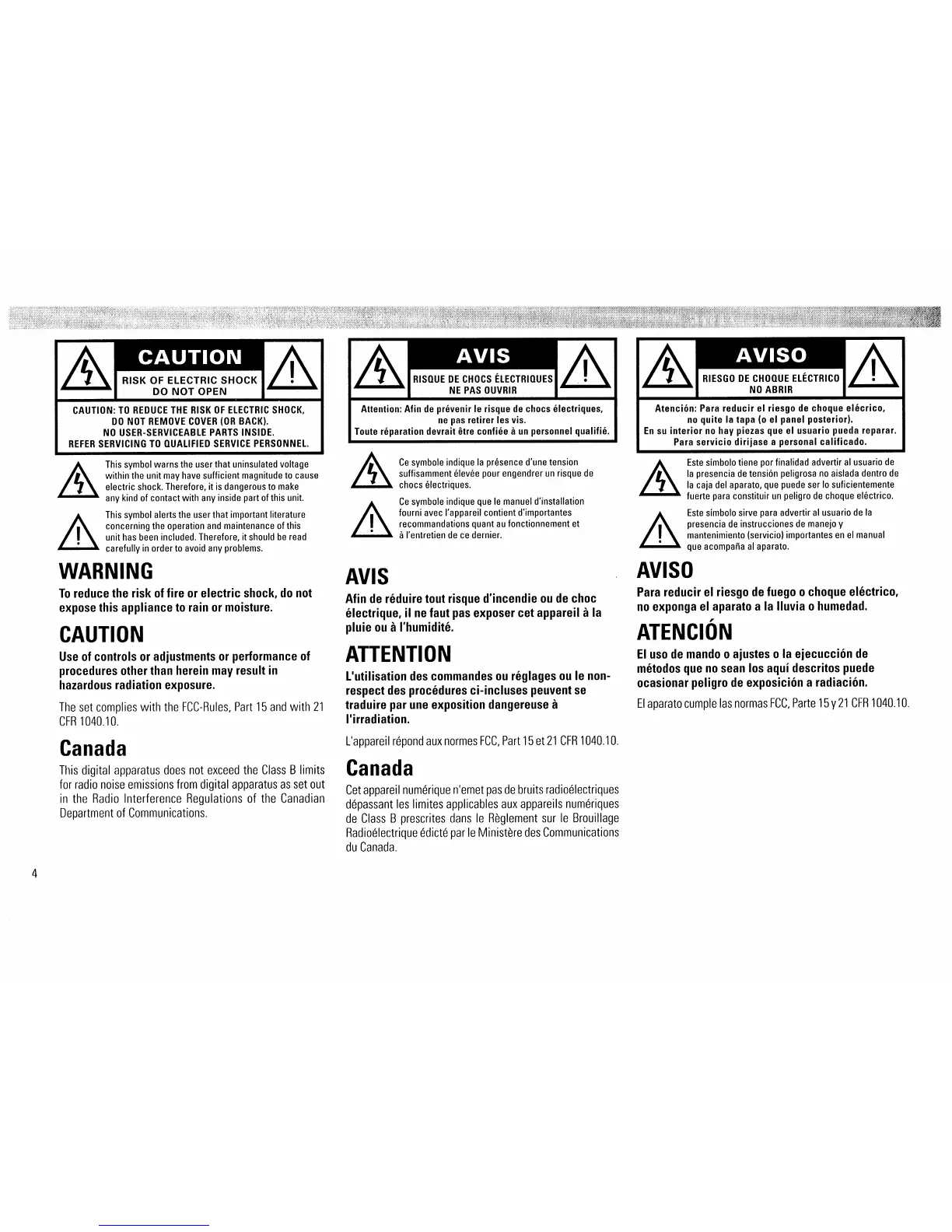 Philips FW390C - General Safety Precautions; Electrical Safety Warnings; Appliance Exposure Warning; Hazardous Radiation Warning