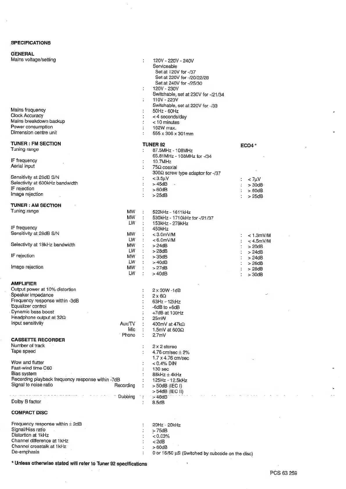 Philips FW41/20 - Specifications; Cassette Recorder