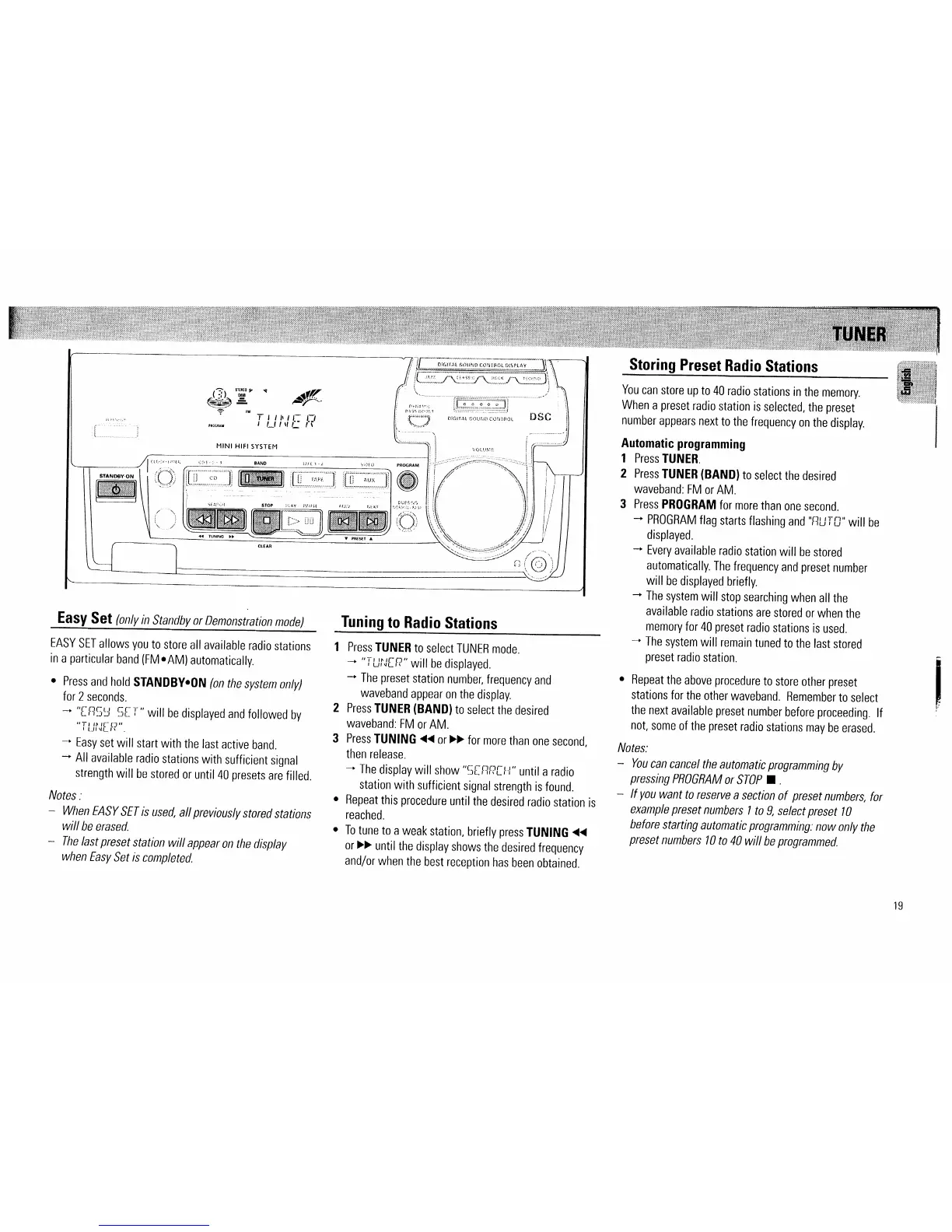 Philips FW520C - Radio Tuning and Presets; Manual Radio Tuning; Storing and Automatic Station Presets