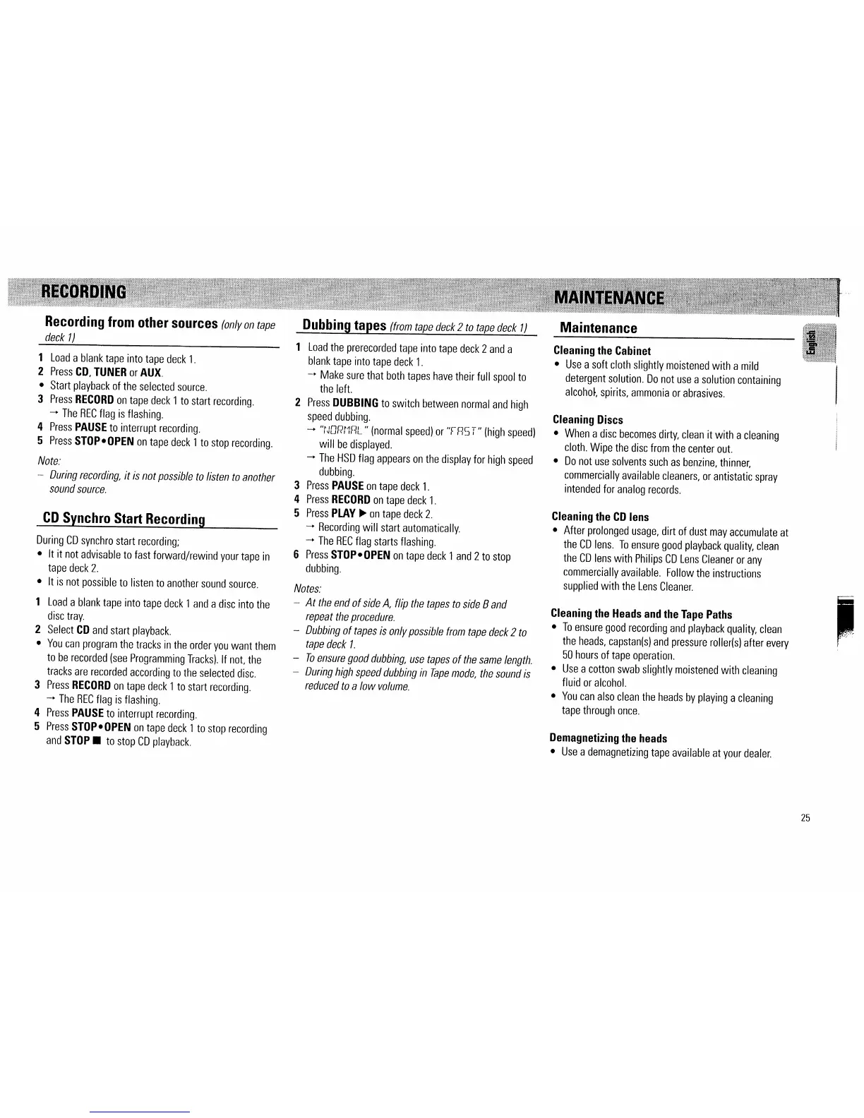 Philips FW520C - Recording and Maintenance; Recording from Sources and CD Synchro; Cassette Dubbing; Component Cleaning