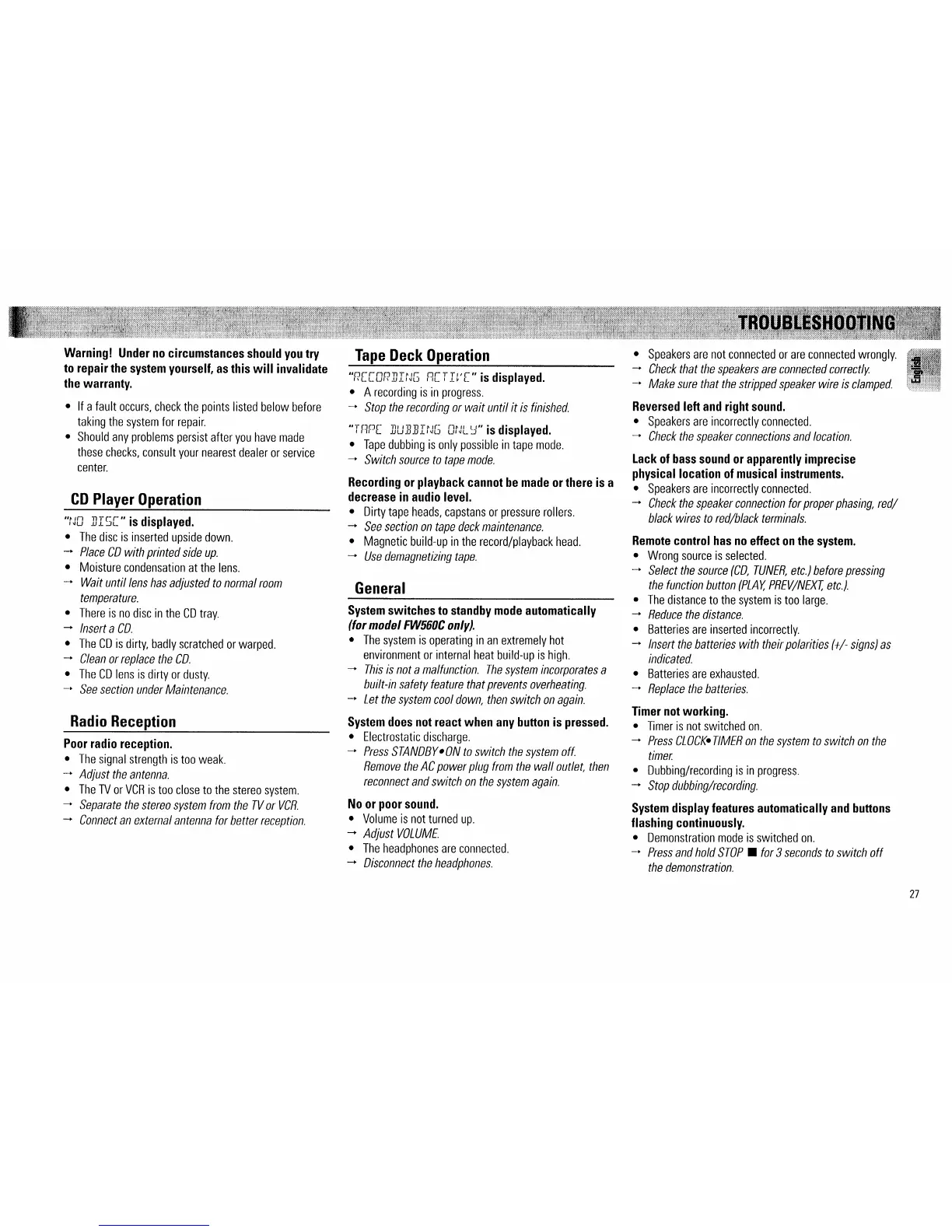Philips FW520C - Troubleshooting Common Issues; CD Player and Radio Troubleshooting; Tape Deck and Sound System Problems; System, Remote, and Timer Issues