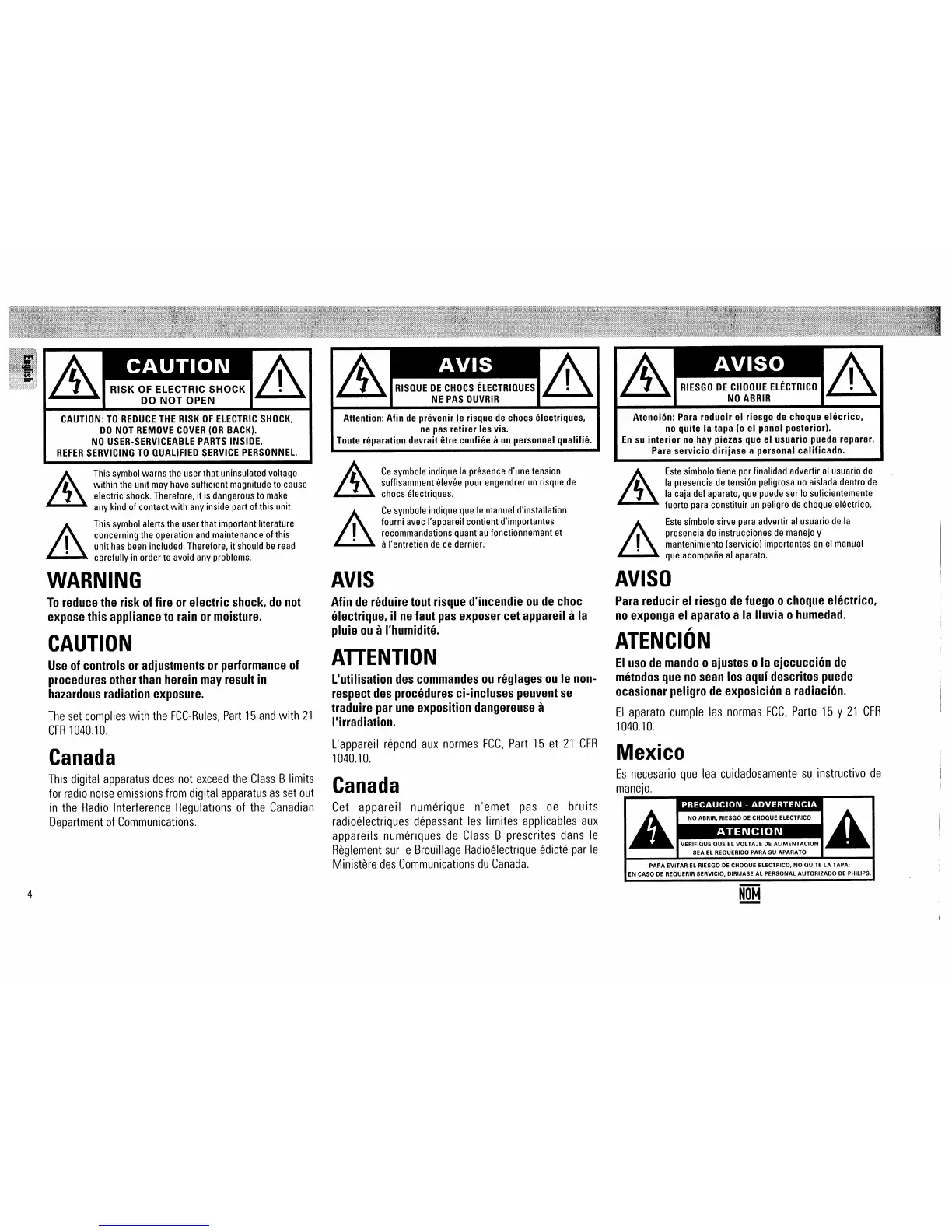 Philips FW520C - Safety Warnings and Compliance; Electrical Hazard and Fire Prevention; Regulatory Compliance