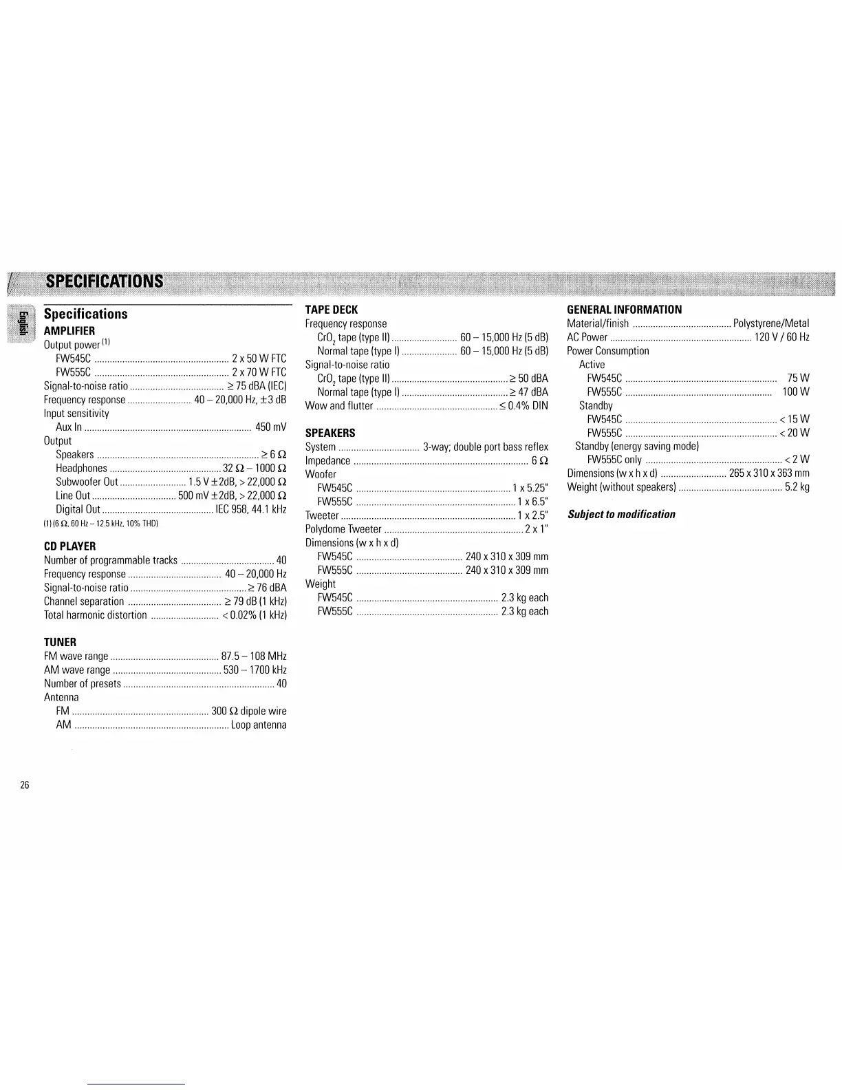 Philips FW545C - Specifications; Amplifier Specifications; Tape Deck Specifications; CD Player Specifications