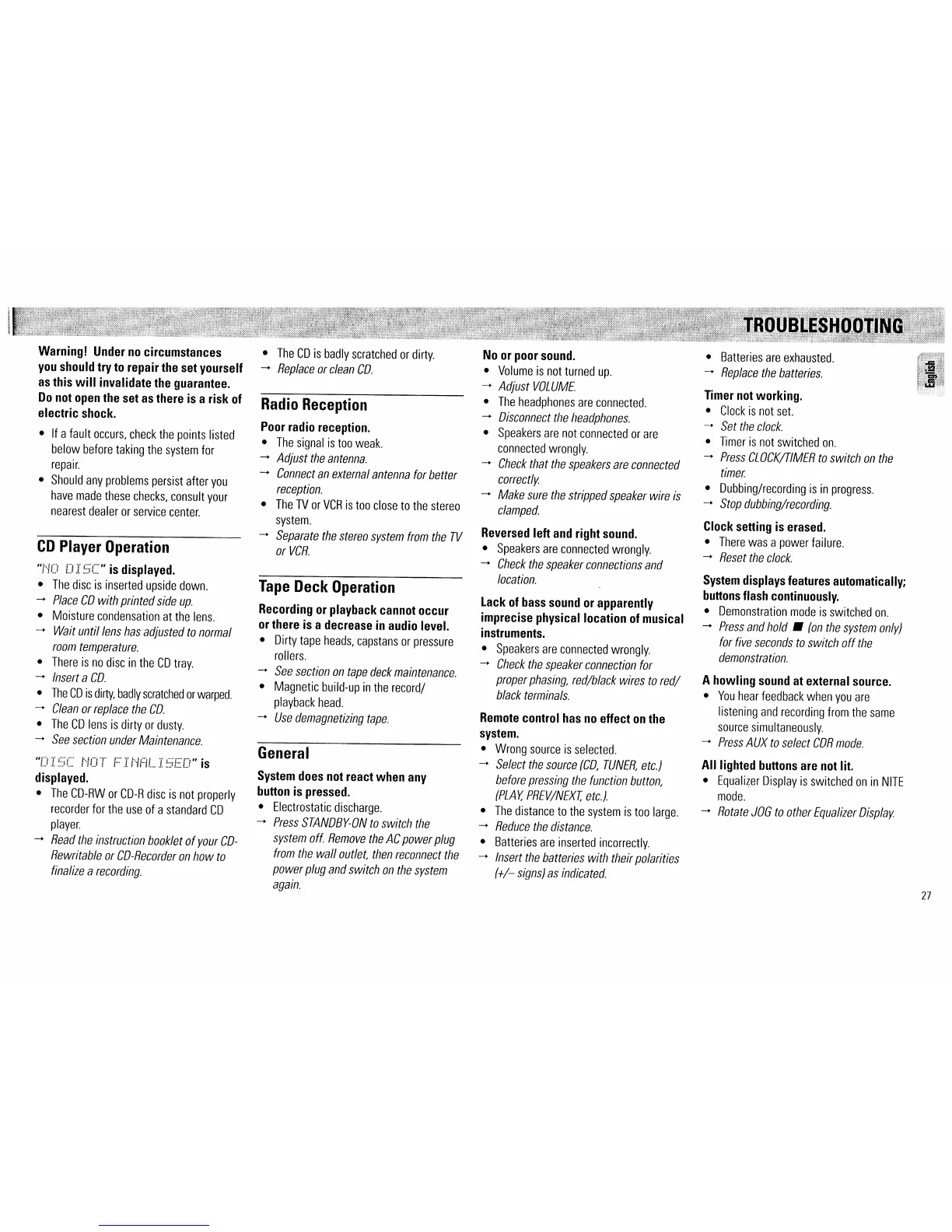 Philips FW545C - Troubleshooting Guide; CD Player and Radio Issues; System Response and Sound Problems; Remote Control and Timer;Clock Problems