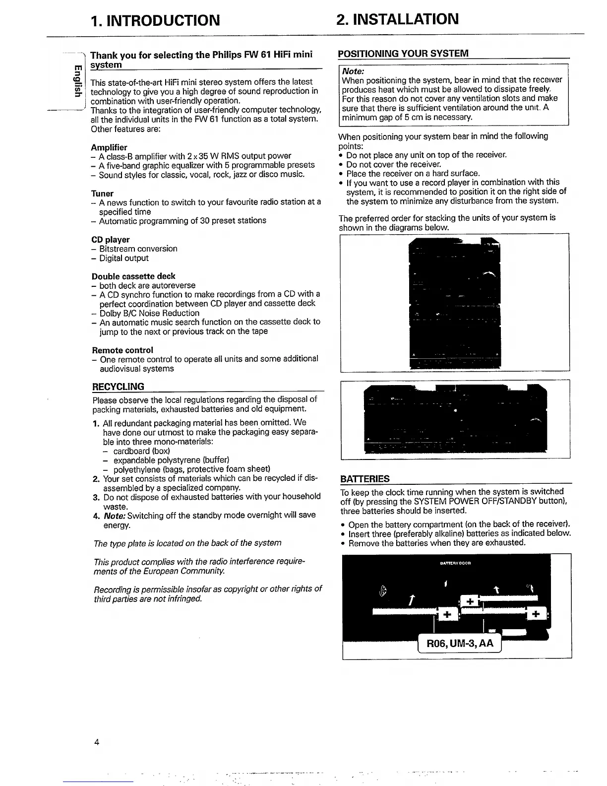 Philips FW61/22 - Introduction and Installation; Amplifier Features; Tuner Features; CD Player Features