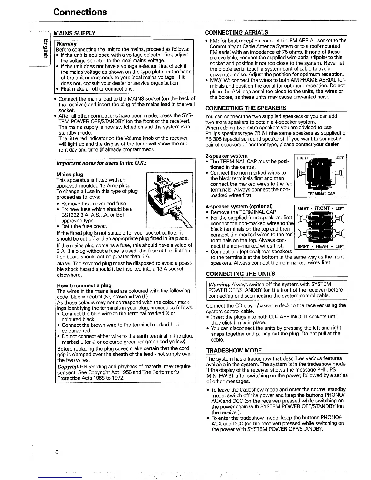 Philips FW61/22 - Mains Supply Connection; Connecting Aerials; Connecting Speakers; Connecting External Units
