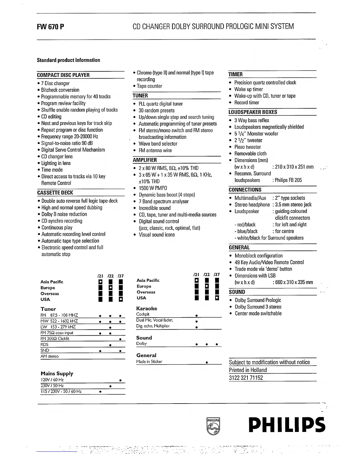 Philips FW670P/22 - Standard Product Information; Compact Disc Player Features; Cassette Deck Functions; Tuner Specifications