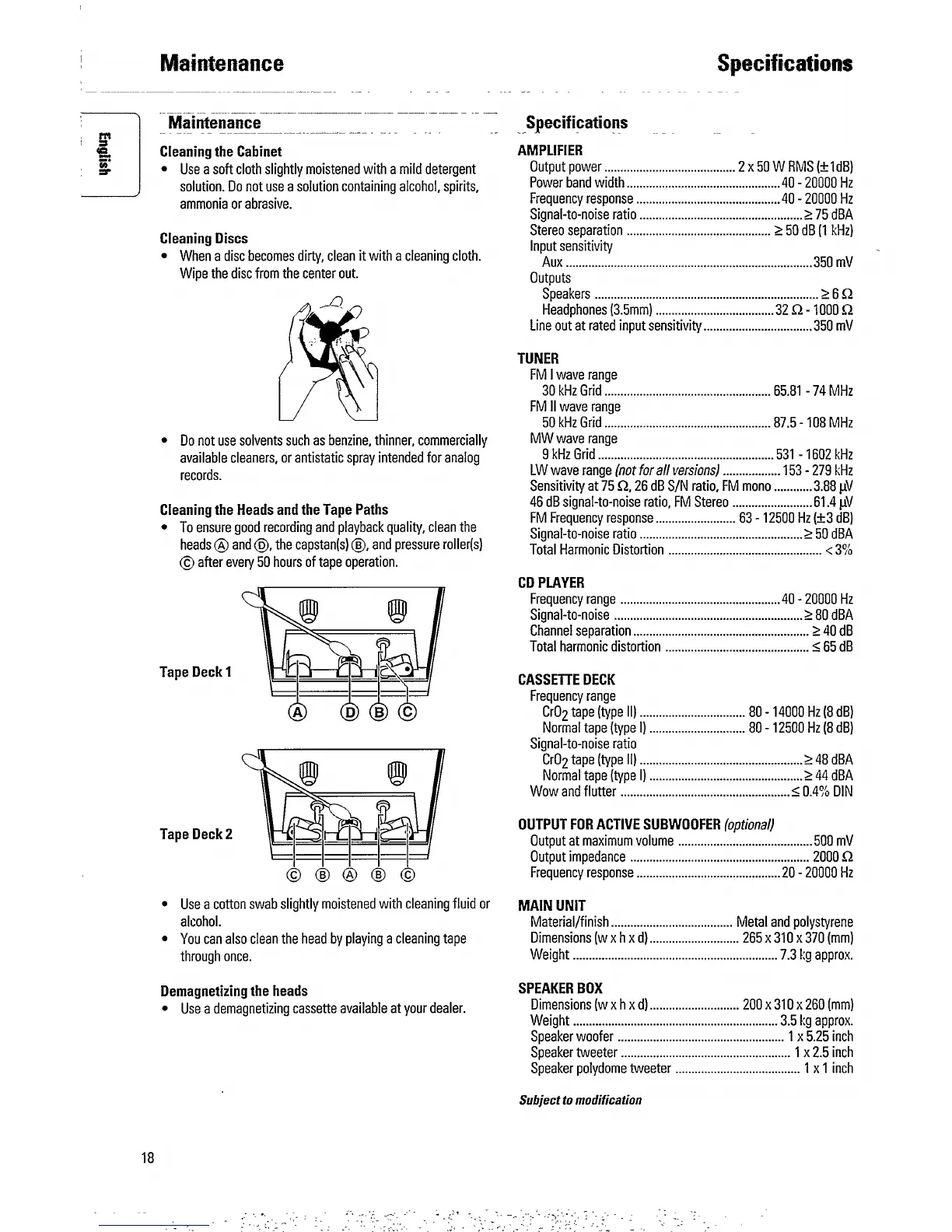 Philips FW730C/25 - Specifications; AMPLIFIER; TUNER; CD PLAYER