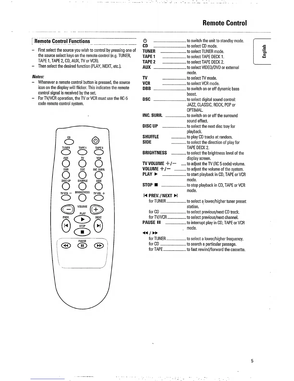 Philips FW730C/25 - Remote Control; Remote Control Functions