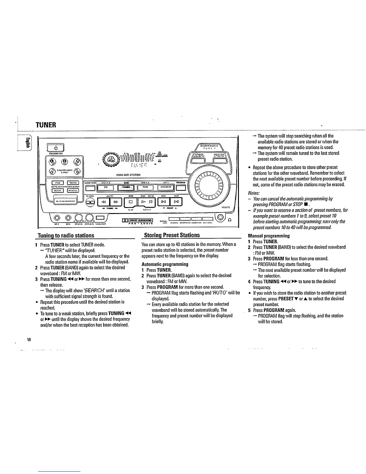 Philips FW860P/21 - Tuning to Radio Stations; Storing Preset Stations; Automatic Programming; Manual Programming