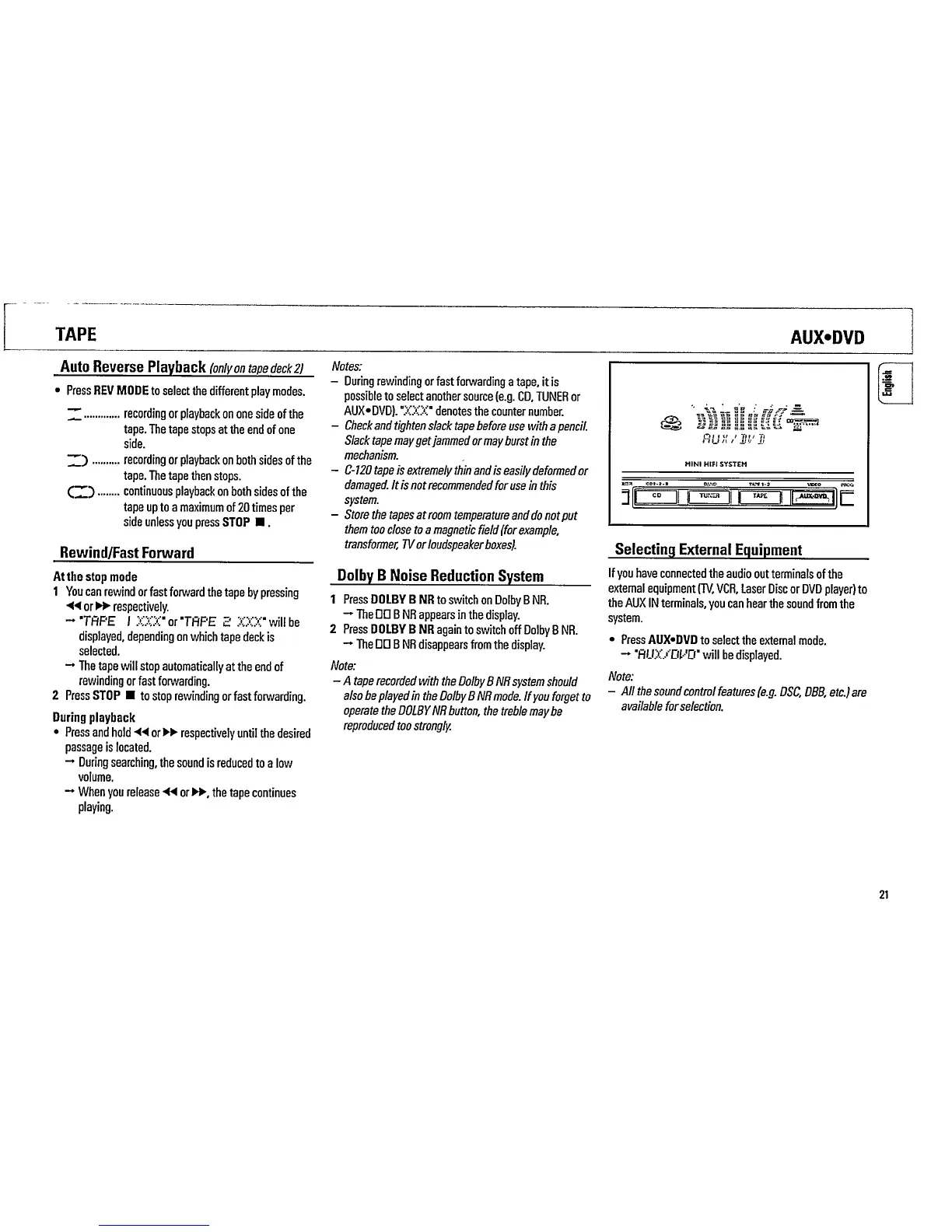 Philips FW860P/21 - Auto Reverse Playback; Rewind;Fast Forward; Dolby B Noise Reduction System; Selecting External Equipment