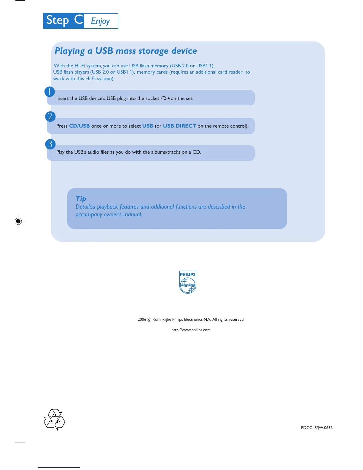 Play the USB’s audio files as you do with the albums/tracks on a CD,