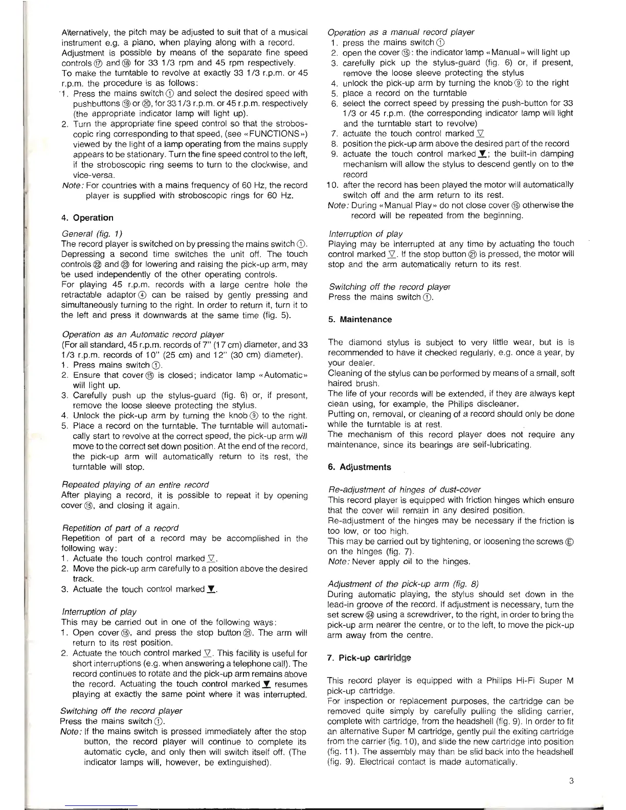 Philips GA 209 - Operation Modes and Playback Control; Maintenance and Adjustments; Pick-up Cartridge Information