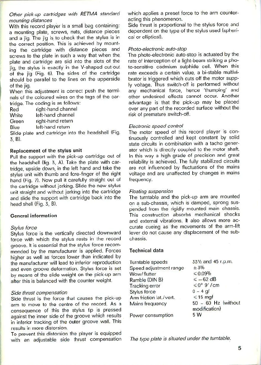 Philips GA 212 - General Information and Technical Data; Stylus Force and Side Thrust Compensation; Technical Data