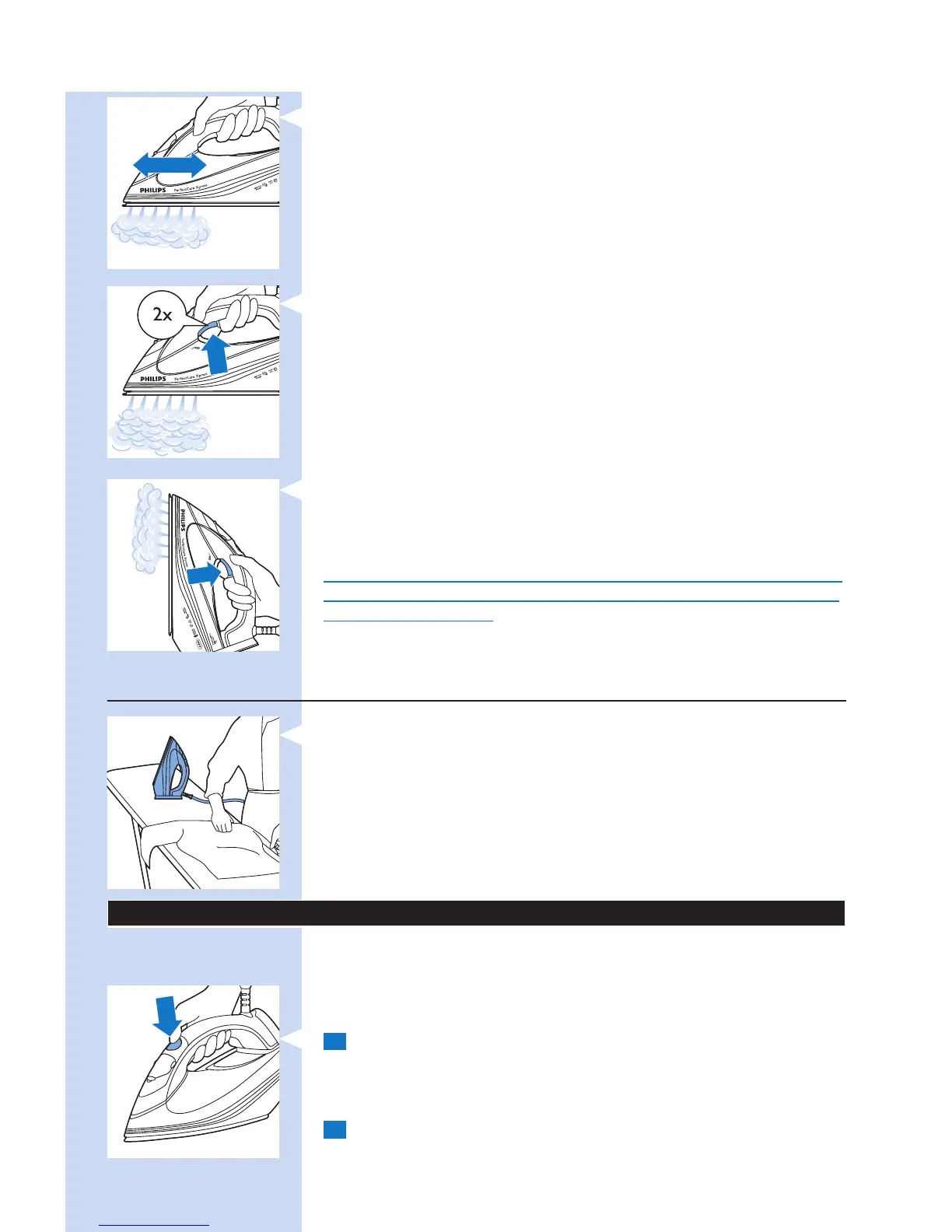 - Paspauskite garų jungiklį du kartus. Iš lygintuvo vieną kartą išsiverš