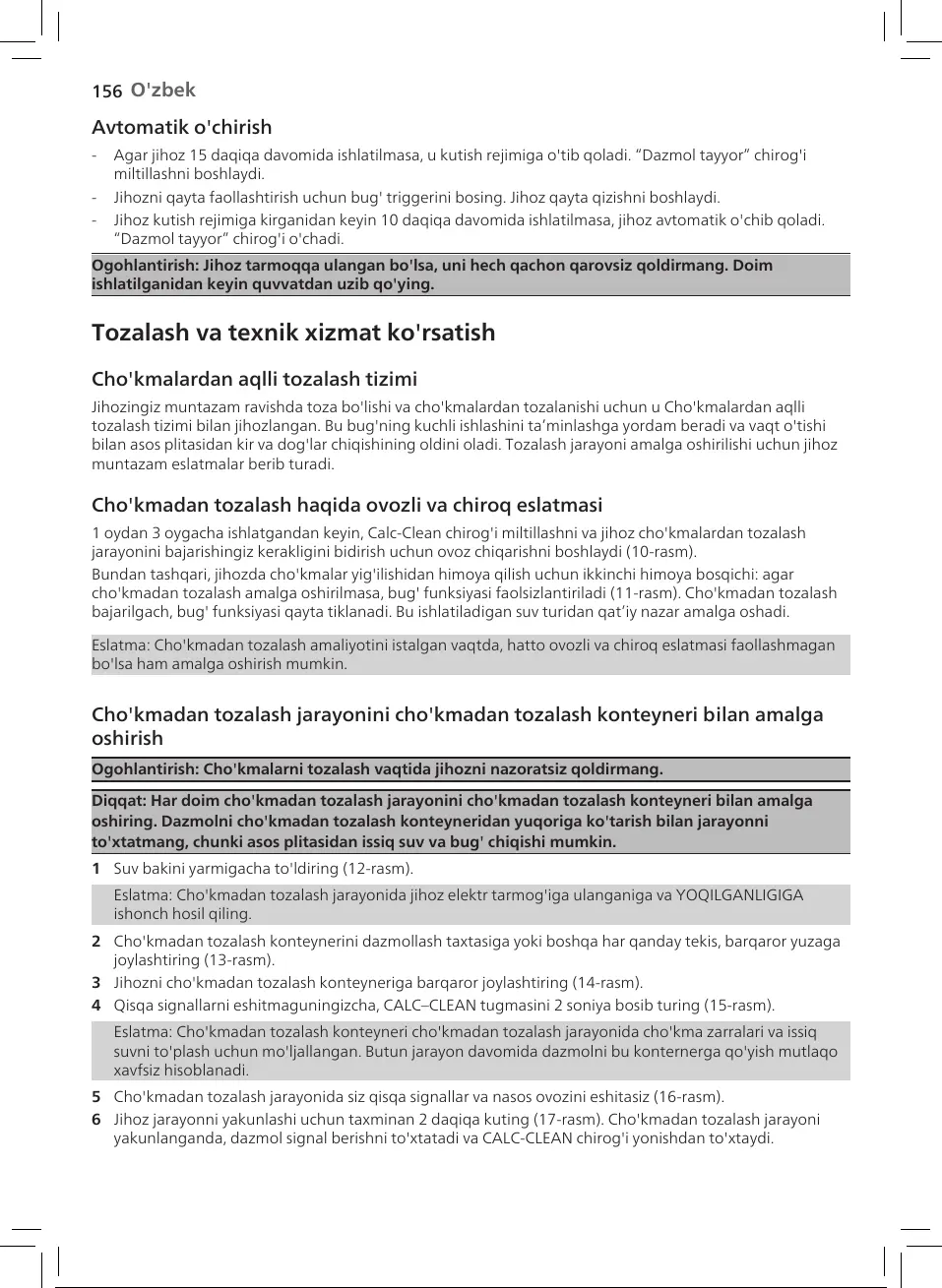 Ogohlantirish: Jihoz tarmoqqa ulangan bo'lsa, uni hech qachon qarovsiz qoldirmang. Doim
