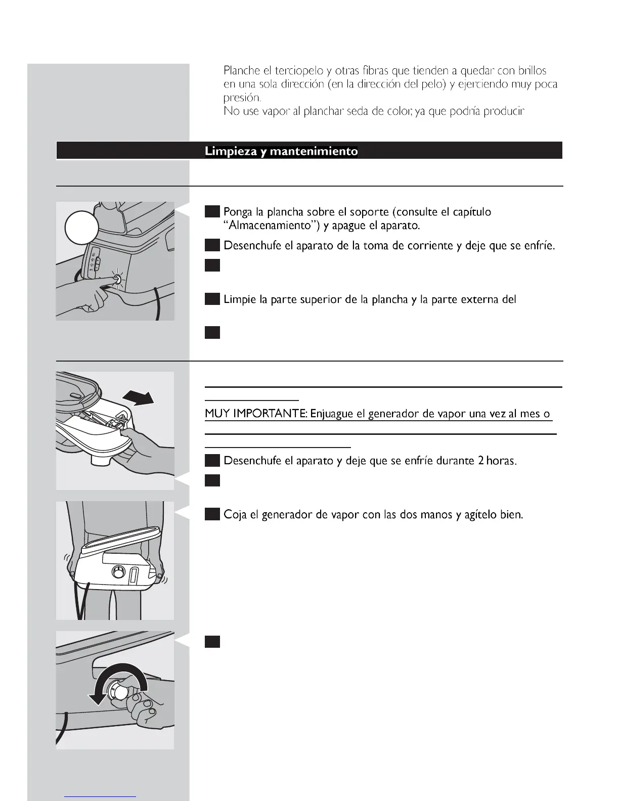 4 Incline el generador de vapor hacia un lado con el tapón de limpieza
