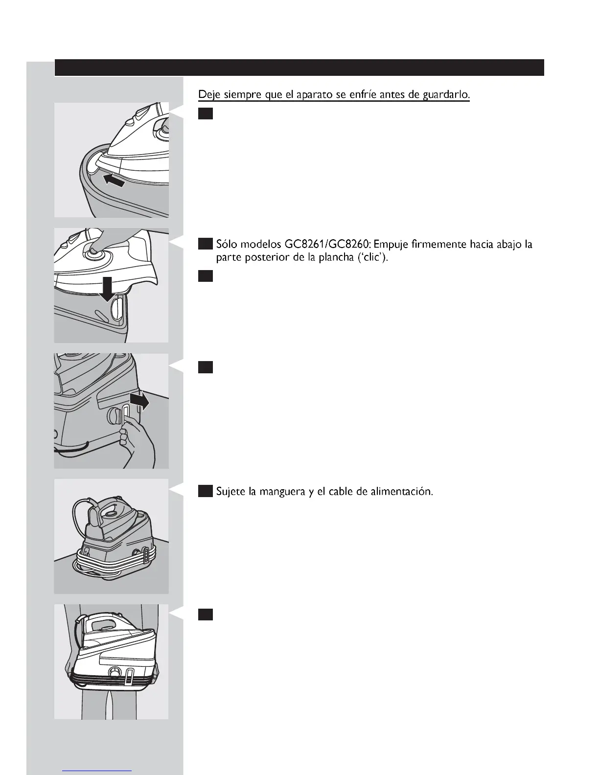 1 lo modelos GC8261/GC8260: Introduzca la punta de la plancha en