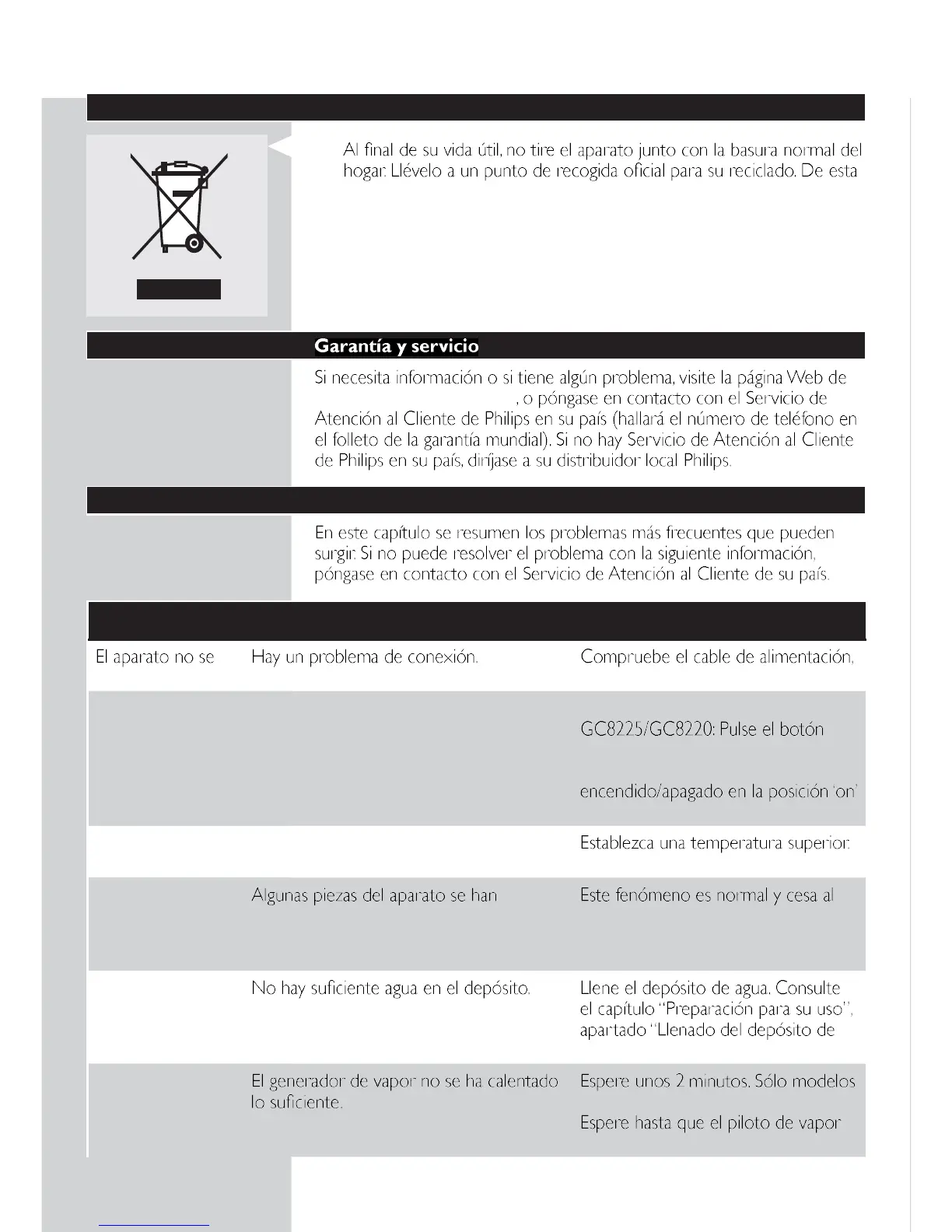 No ha encendido el aparato. Modelos GC8261/GC8260/
