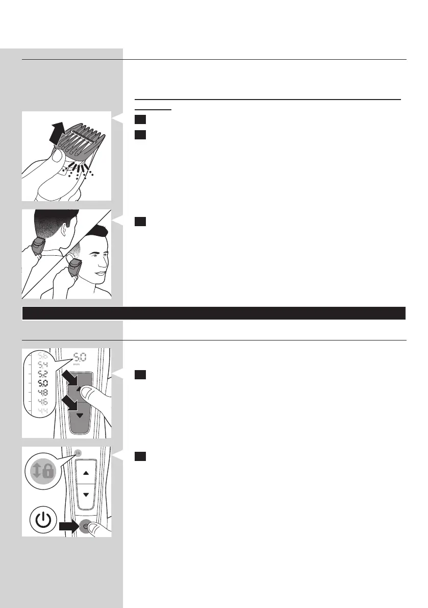 使用不带修剪梳的修剪器以贴近皮肤的距离(0.5 毫米)