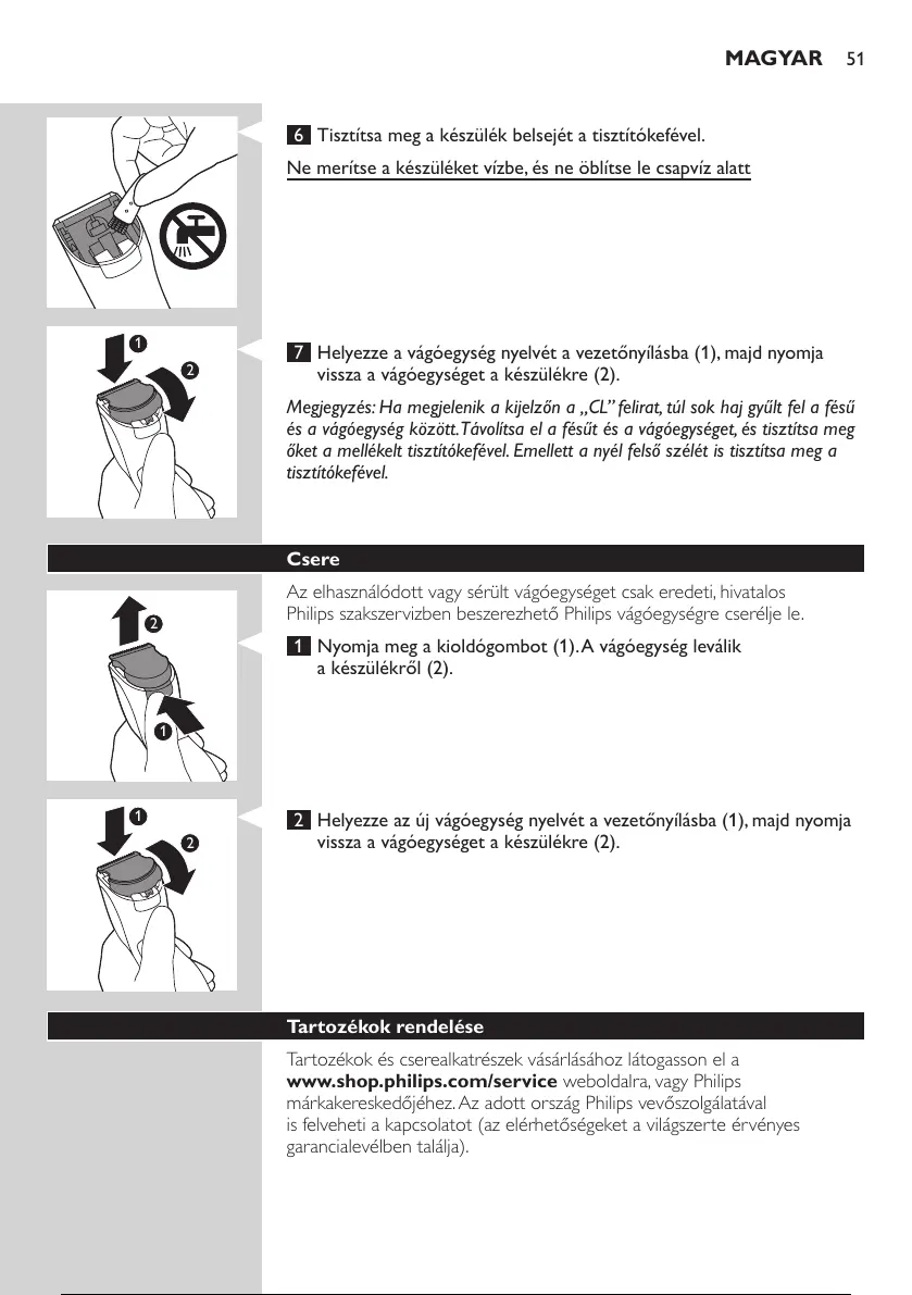 és a vágóegység között. Távolítsa el a fésűt és a vágóegységet, és tisztítsa meg