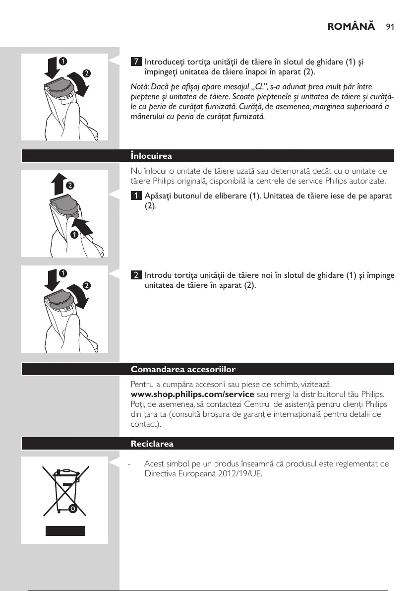 Notă: Dacă pe aşaj apare mesajul „CL”, s-a adunat prea mult păr între