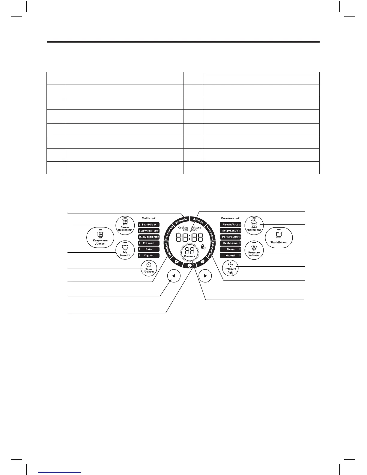 q Sauce thickening button y Lid unlocked indicator