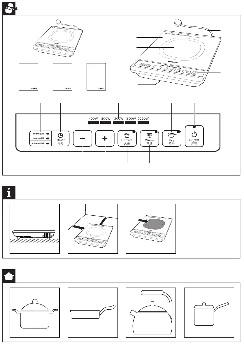 There are three cooking modes: Hot pot ( ), Warm ( ), and Fry ( ).